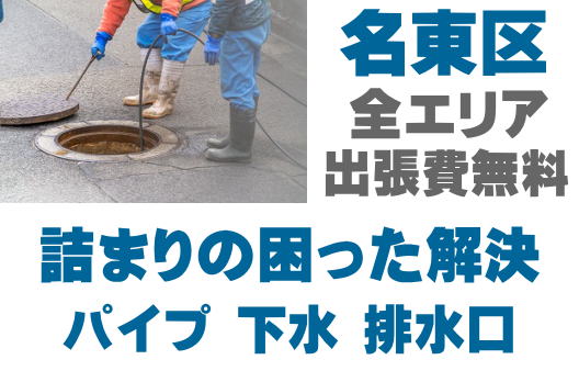 名東区で排水つまり、トイレ詰まり、シンクつまりなどの排水トラブルはお任せください。店舗の厨房、グリストつまりも対応しております。配管つまり、マンホールの溢れ、下水の臭い、排水管のトラブルは最短15分到着!