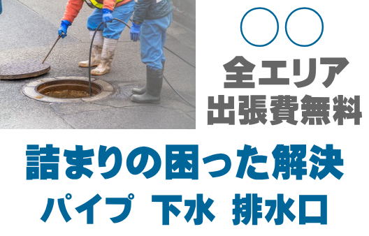 ○○で排水つまり、トイレ詰まり、シンクつまりなどの排水トラブルはお任せください。店舗の厨房、グリストつまりも対応しております。配管つまり、マンホールの溢れ、下水の臭い、排水管のトラブルは最短15分到着!